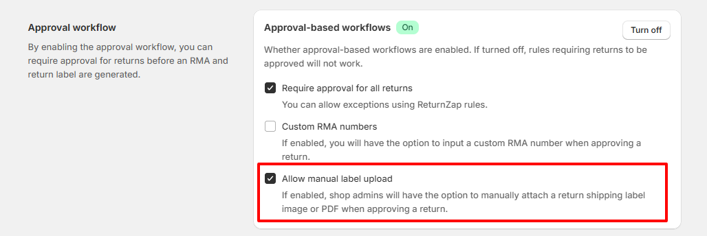 Once this setting is enabled, admins reviewing returns will have the option to attach an external shipping label as part of the approval process.
