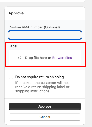 When the return is reviewed by a customer service agent or admin, they will see the option to upload an external shipping label file when approving the return.