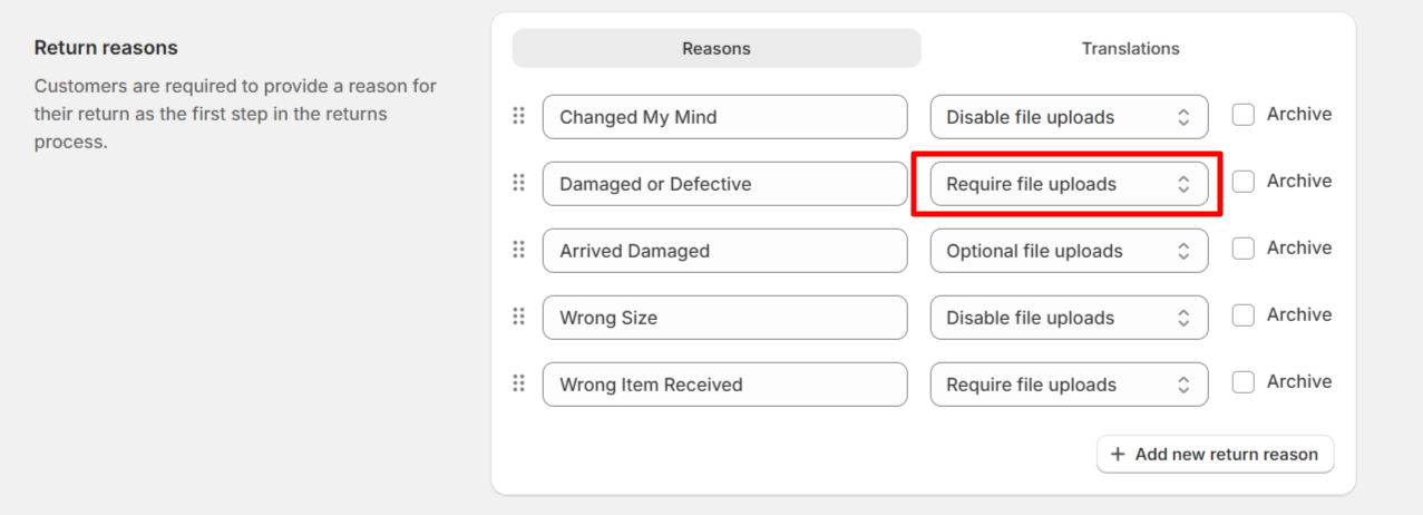 To configure this: Go to your return reasons settings, select a return reason, and use the file upload dropdown to set your preference.
