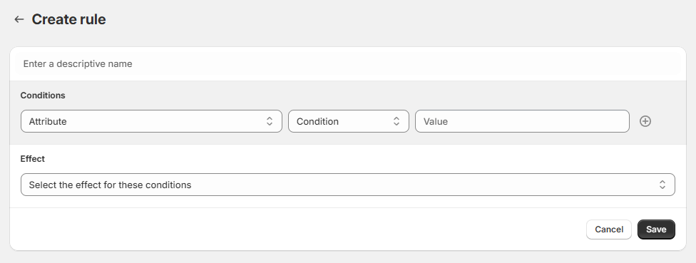 Rules are made up of conditions and effects. Each rule can have multiple conditions but only a single effect.