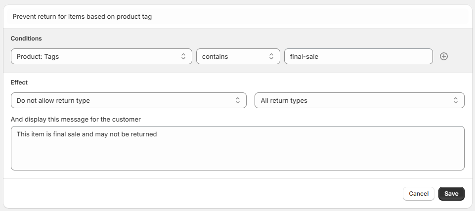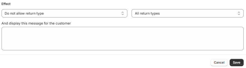 Some rule effects allow you to display a custom message in the return portal. For example, when preventing specific types of return you can define a message for customers, explaining your policy.