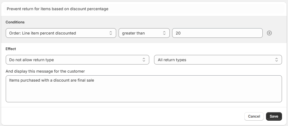 Prevent return for items based on discount percentage