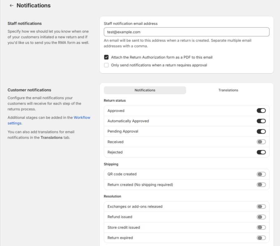 From the notifications setting page, you can configure ReturnZap to send a notification to a predefined email address whenever a return is created. Usually this is set to the store owner, or to a customer service representative.