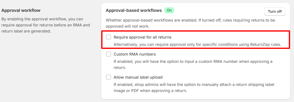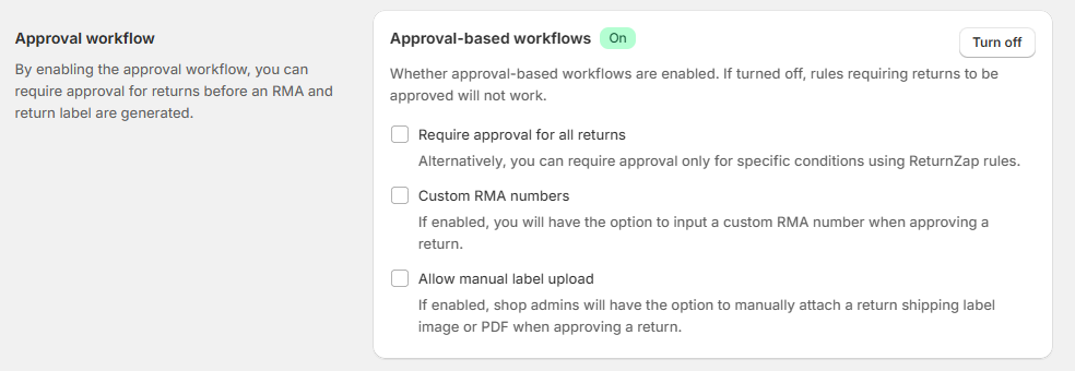 Approval workflows can be enabled in ReturnZap Settings > Workflow