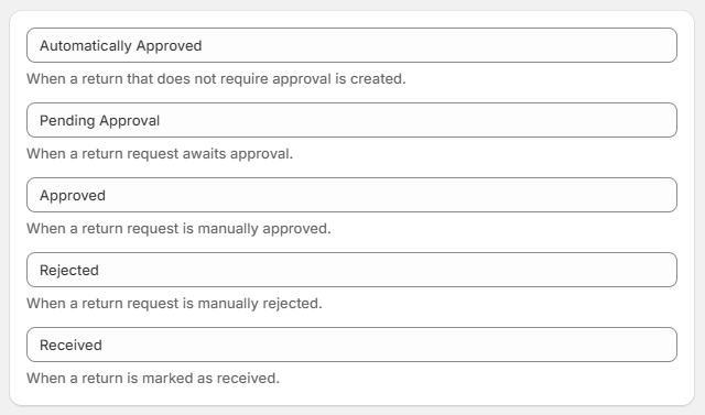 You can keep your customers updated on progress for each stage of the return approval process by updating your notification templates in Settings > Notifications.
