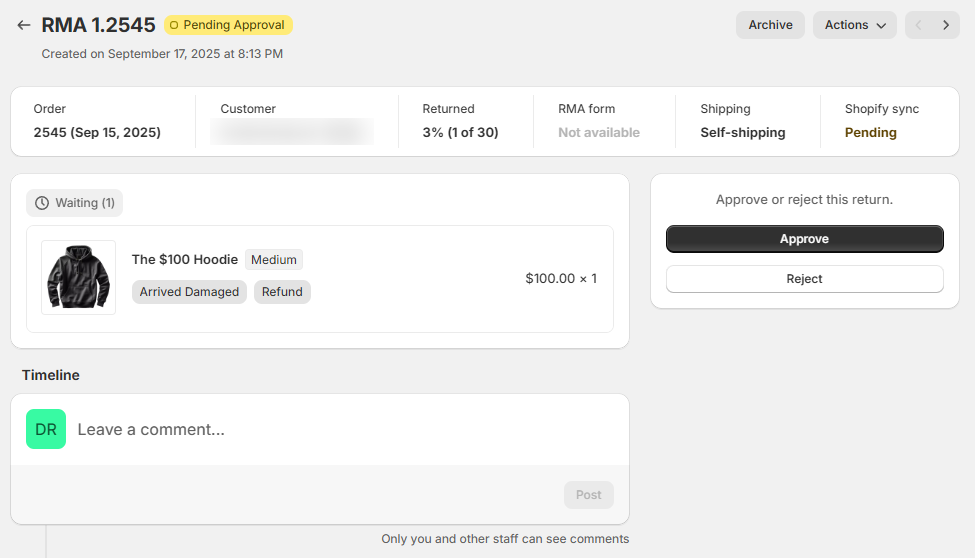 You can review the return request and approve or deny it by clicking into the return. The sidebar will prompt for two actions: