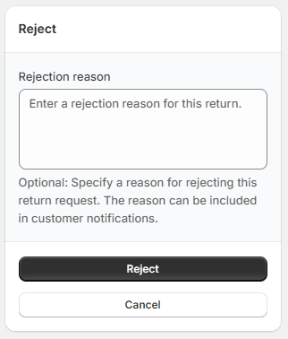 Shops may reject return requests submitted by customers. This can be done by accessing the return page and clicking the Reject button.