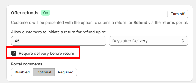 Note that not all shipping carriers sync tracking events to Shopify, so please confirm that delivery events are present on your Shopify orders before enabling this feature otherwise customers will not be able to initiate returns.
