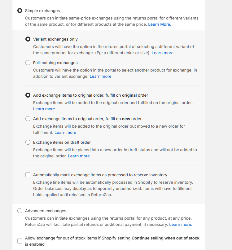 If the setting for exchanges on the original order is enabled, ReturnZap will follow these steps: