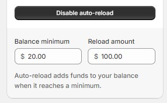 You may optionally set up auto-reload logic. With auto reload, the reload amount will be automatically charged to your default payment method when your balance minimum is reached.