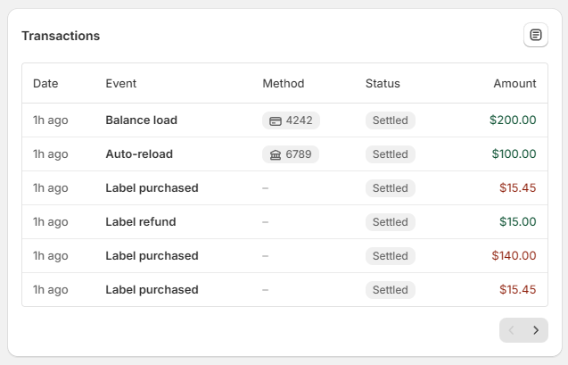 Clicking the details icon in the top right of the transactions page will expand the list to provide more information about each transaction, including the RMA number associated with each label purchase.