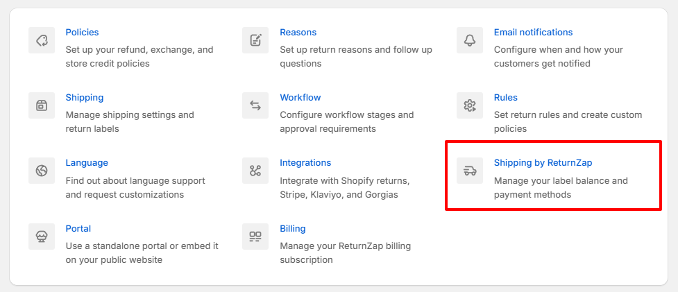 Once enabled, you will see a link to manage Shipping by ReturnZap from the primary ReturnZap settings page.