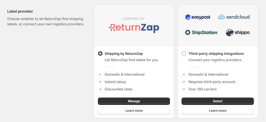 Shipping by ReturnZap allows you to purchase return shipping directly through ReturnZap, without the need to connect a third party shipping integration.