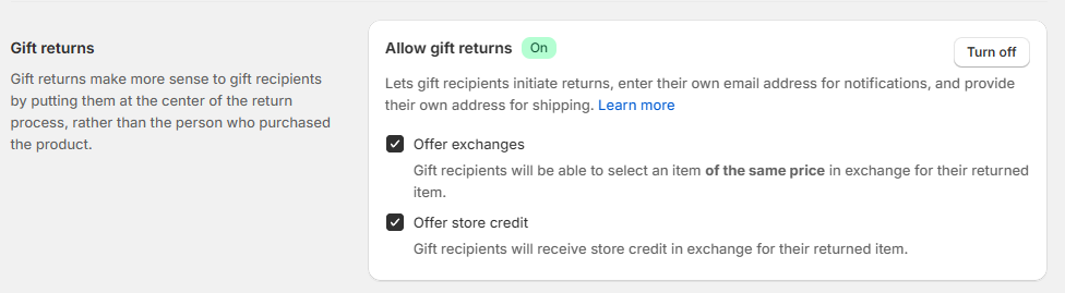 Enable or disable gift returns using the Turn On / Turn Off toggle in the top right .