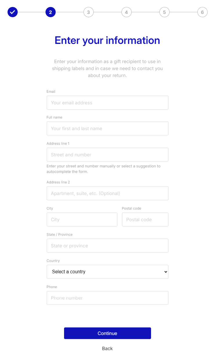Once an order is retrieved, the customer will be prompted to input important contact information used to facilitate the gift return: