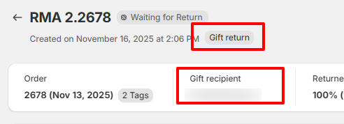 The return page will also include a tag indicating that the return is a gift return, as well as an identifier for the gift recipient name in place of the standard customer name: